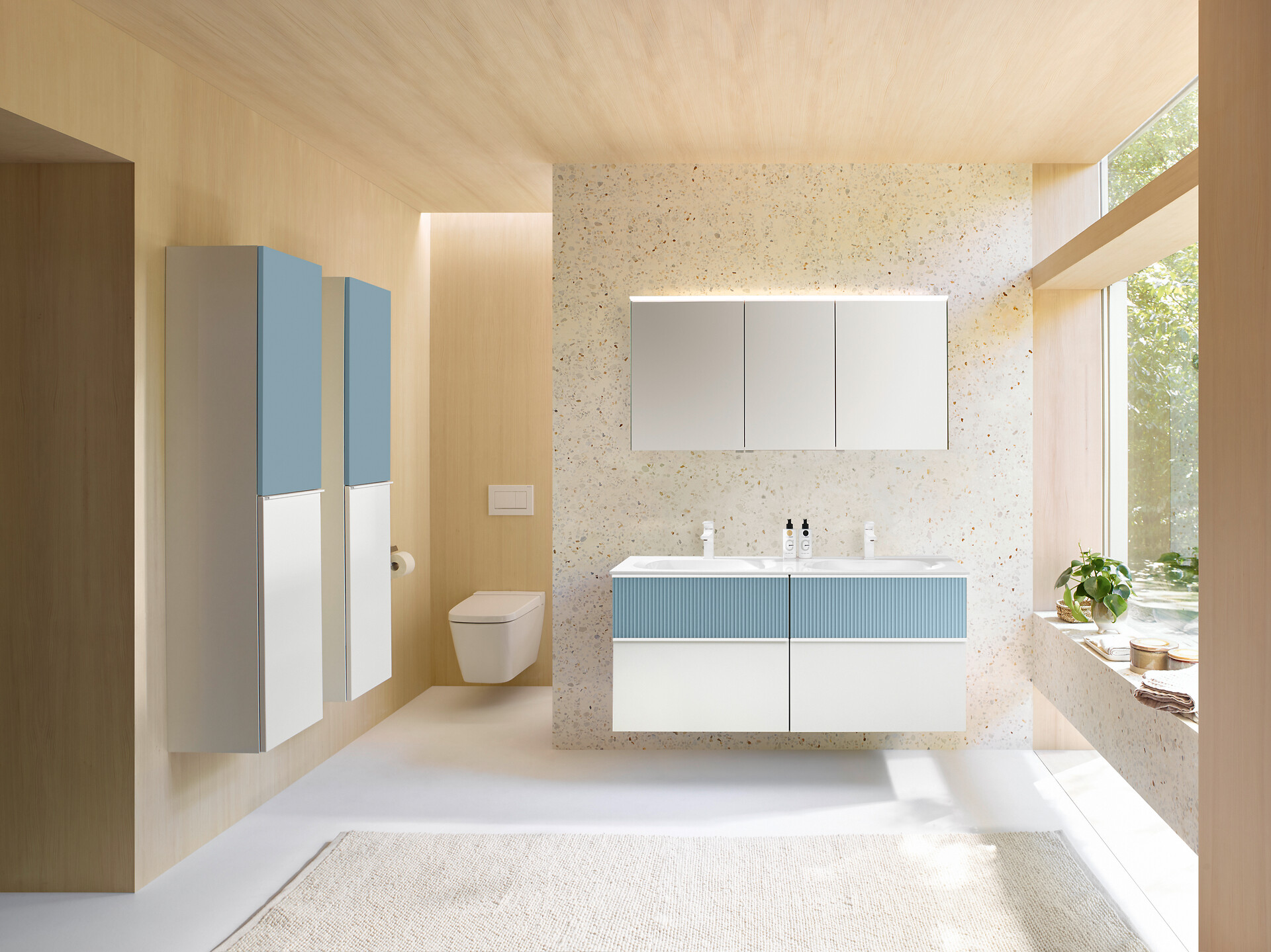 Für das Badezimmer hat Designer Patrick Frey diesen Trend zusammen mit burgbad nun praxistauglich umgesetzt: Statt der horizontalen Profilierung mit Plisseefronten bei der Originalkollektion Fiumo zeigen die neuen Fronten von Fiumo 2.0 ein vertikales Muster. Die eingefräste, thermofolierte Oberflächenstruktur wirkt dabei eher filigran als robust – ein feines Linienmuster, das dem Möbel mit seinem Schattenspiel Lebendigkeit verleiht und es weniger massiv wirken lässt. Typisch burgbad: Mit den weich ausgearbeiteten Kanneluren ist das Oberflächenrelief nicht nur besonders pflegeleicht, sondern erweist sich auch als echter Handschmeichler.
